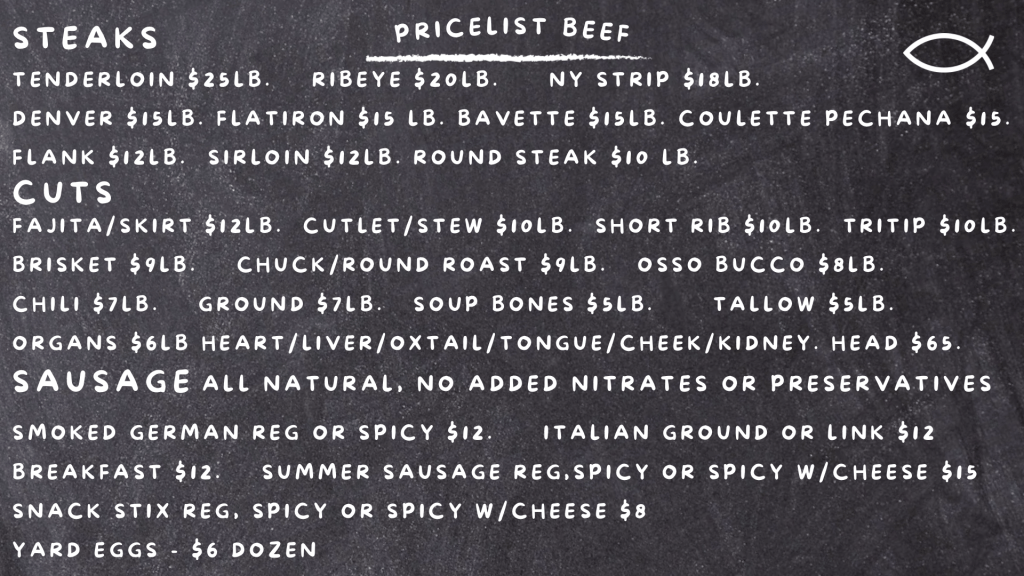 includes : brisket, flank steak, tenderized skirt fajita, tri tip, ny strip, ribeye steak, tenderloin, sirloin, short ribs, chuck roast, flat iron steak, canoe cut marrow bones, ground beef, offals (beef fat, oxtail, cheek, liver, heart).